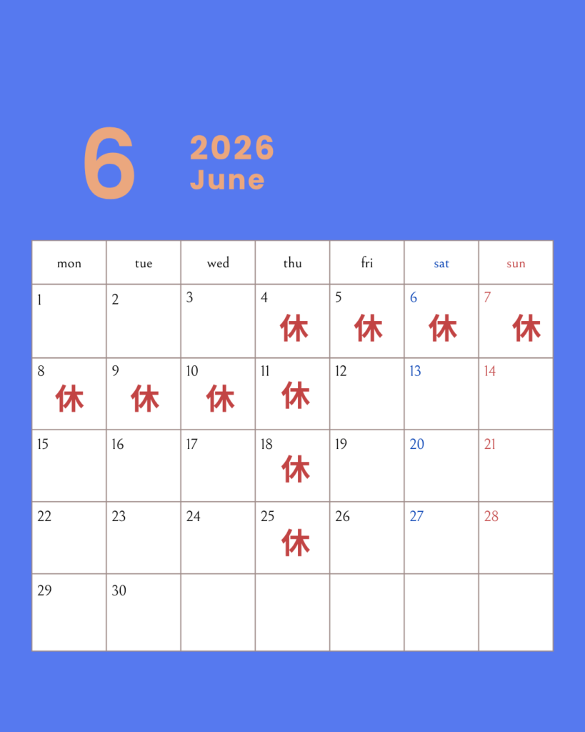 6月は長期休暇をいただきます。どうぞよろしくお願いいたします。